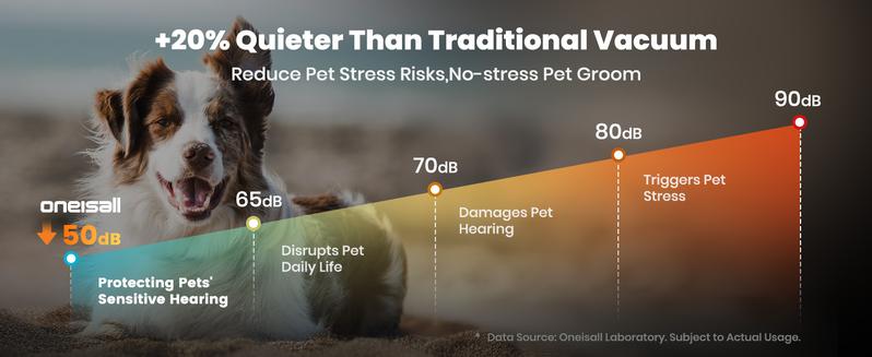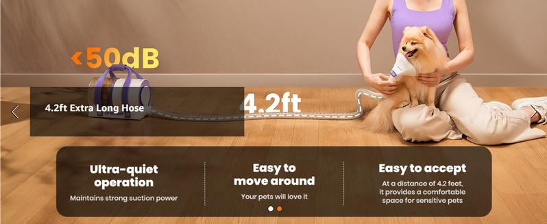 LOW NOISE DESIGN: Less than 58db sound, so your dog is no longer afraid of suctioning hair, 5.2ft extended hose keeps your pet further away from the motor noise, making it more suitable for sensitive or large pets, won't scare your dog, 3 adjustable suction levels provide more expandability.