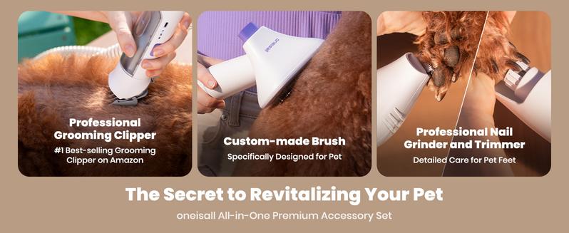 ONEISALL PROFESSIONAL HOME GROOMING: Comes with a vacuum package that offers 4 cleaning tools, including a cleaning brush that's perfect for picking up loose hair from surfaces and clothing. The comb and detangling tool gently removes loose hair, leaving your pet's coat shiny and smooth while eliminating tangles. Nozzle head and brush can be used to collect pet hair from carpets, sofas and floors.